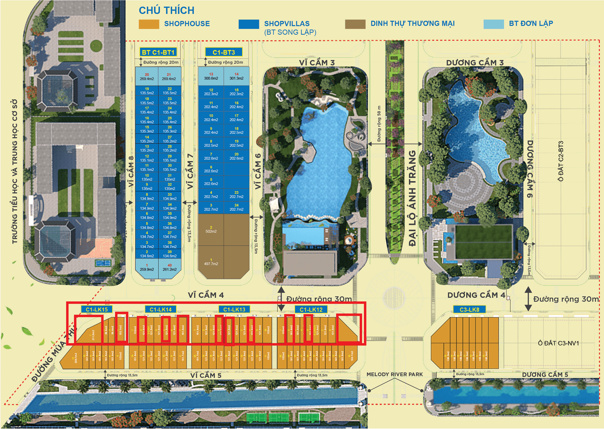 - Bán shophouse C1-LK12 đường 30m hướng Đông Bắc diện tích 238m2. View góc ngã tư đường siêu Vip, Đại lộ Ánh Trăng và đường 30m