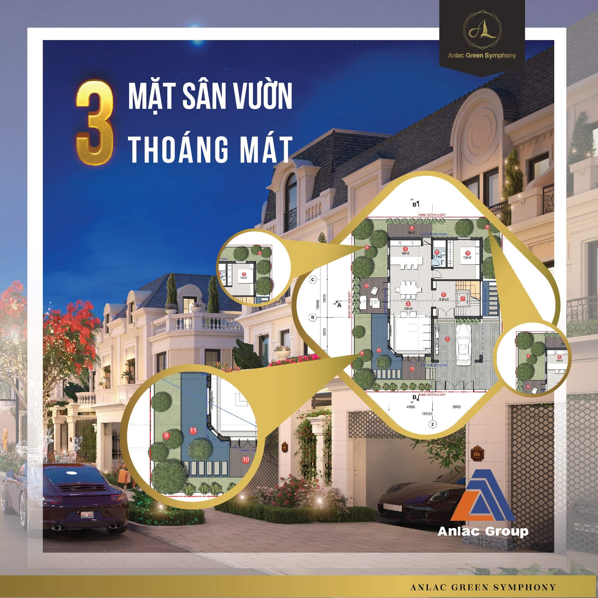 Ngoài tiện ích chung là các công viên nội khu, lối dạo cảnh quan xanh mát, mỗi biệt thự Anlac Green Symphony đều có sân vườn bao quanh 3 mặt, đủ để các chủ nhân thỏa mãn sở thích trồng cây, chăm hoa, tạo lập lối sống giao hòa thiên nhiên.