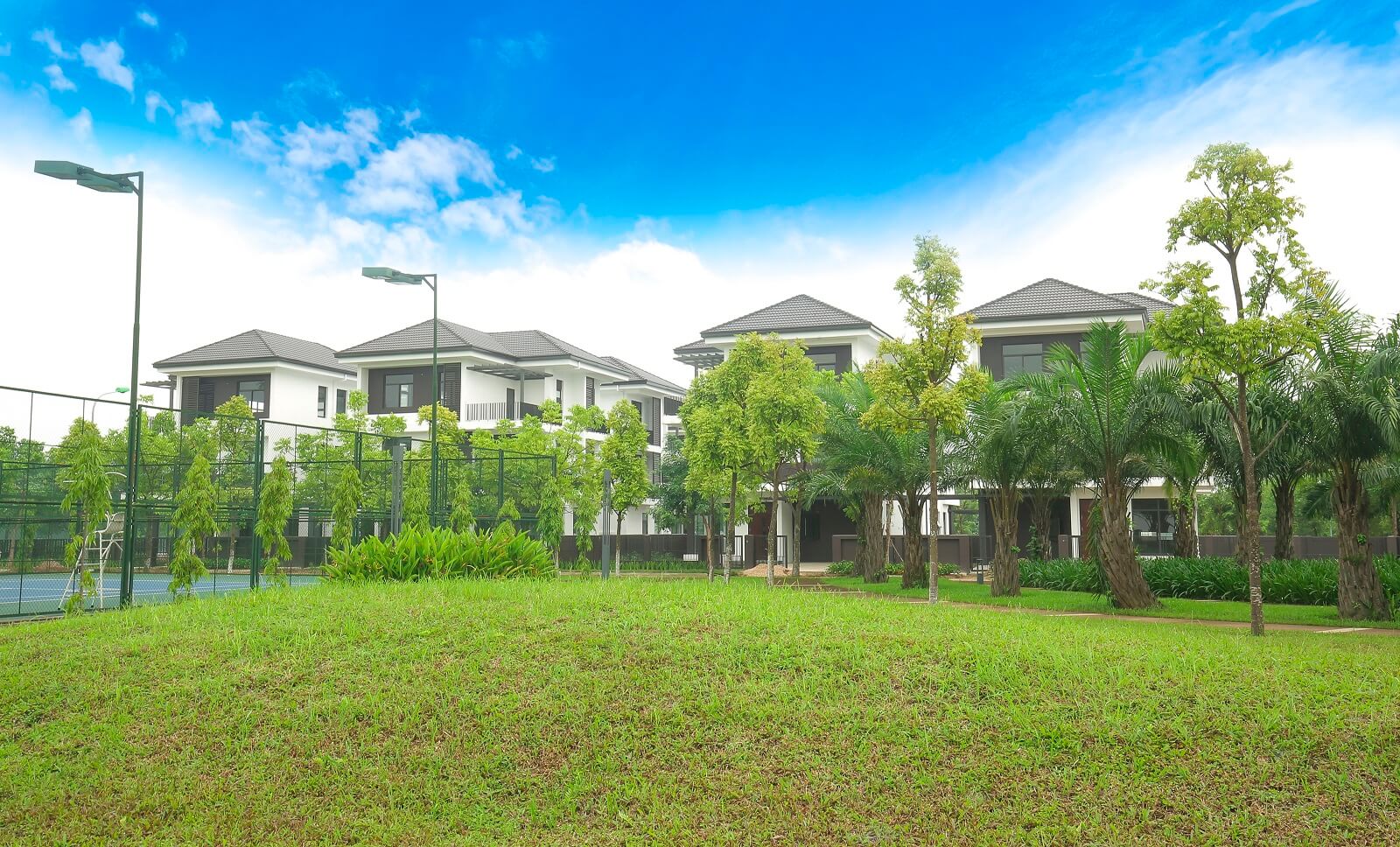 Các con đường đều có cây xanh trồng dọc theo vỉa hè dành cho người đi bộ. Ở giữa khu biệt thự là công viên được bố trí trồng những cây có tàng che lớn tạo bóng mát cho nơi sinh hoạt cộng đồng.