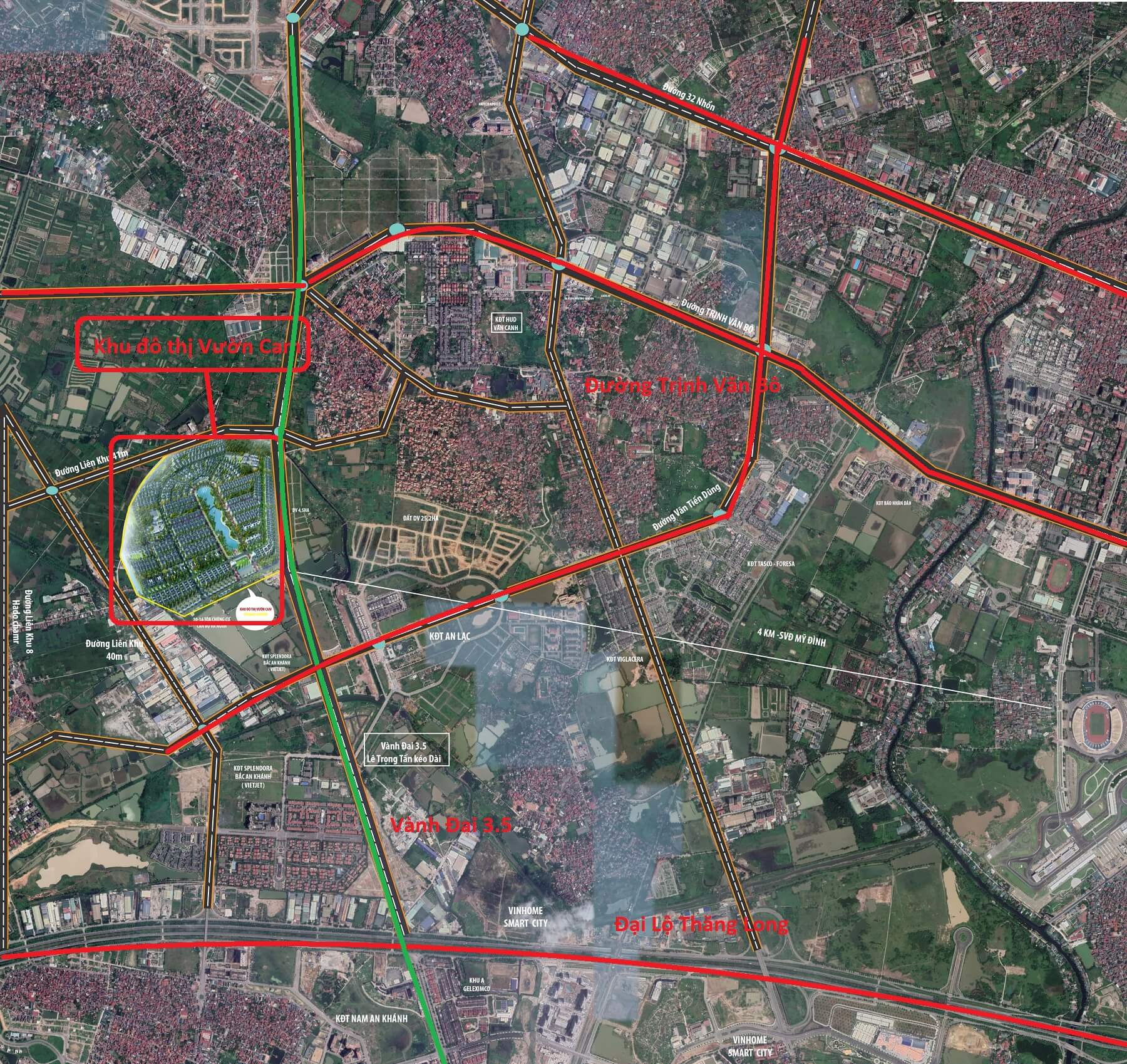 Sau khi đường 3.5 hoàn thiện để kịp đưa Hoài Đức lên quận trước năm 2020. Từ dự án Vườn Cam sẽ rất dễ dàng di chuyển ra đường 32, Đại Lộ Thăng Long, Sân vận động Mỹ Đình.