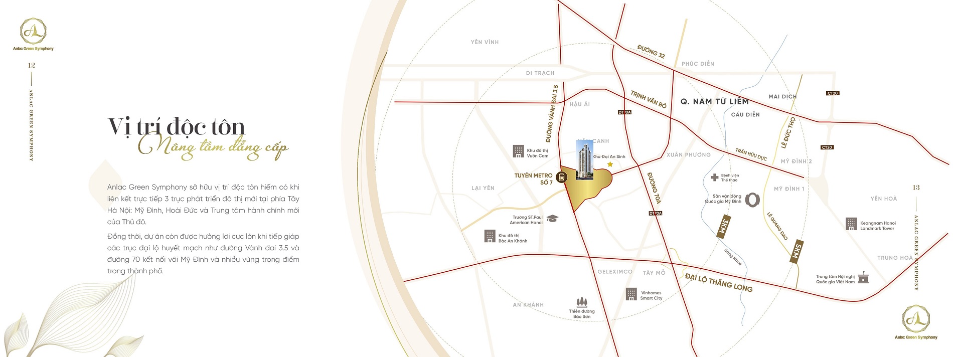 Khu đô thị Anlac Green Symphony sở hữu tọa độ đắt giá tại trung tâm phát triển mới phía Tây Thủ đô, thuộc địa phận Vân Canh, Hoài Đức. Đây được coi là vị trí “lõi” kết nối các trục đại lộ và giao thông huyết mạch như: đường Trịnh Văn Bô, đường nối Phạm Hùng (vành đai 3) tới vành đai 3.5, đường 70A nối từ Nhổn tới Đại lộ Thăng Long, tuyến Metro số 7 chạy qua khu đô thị.