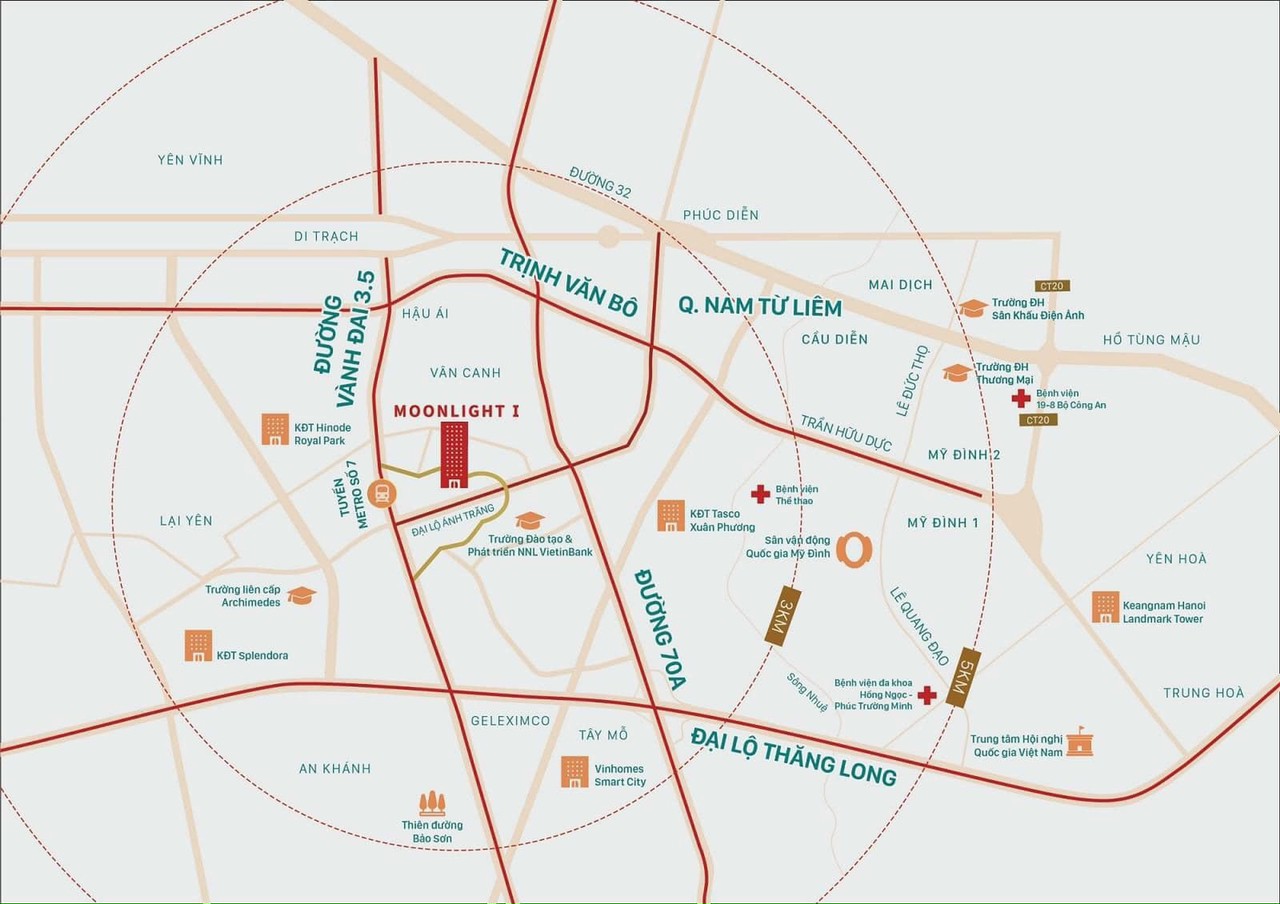 Vị trí đắc địa kết nối khu vực lân cận thuận tiện, cư dân Chung cư Moonlight chỉ mất vài phút di chuyển để có thể đến các quận lân cận như Cầu Giấy, Bắc Từ Liêm…